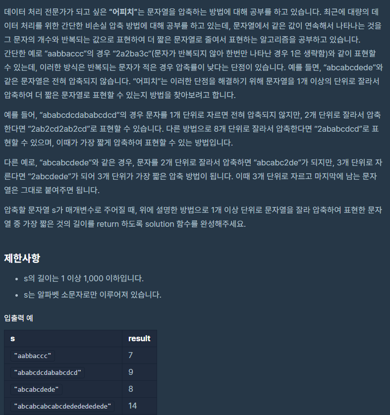 주어지는 문자열을 특정 길이만큼 잘라서 같은 문자면 숫자로 바꿔 표시했을 때의 (1은 생략) 그 문자열의 길이가 가장 짧은 순간을 찾는 문제