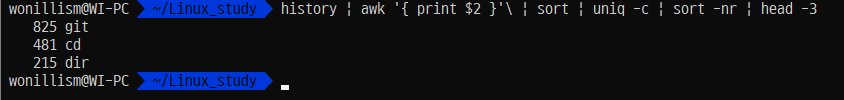 리눅스를 사용하며 가장 많이 사용된 명령어 3개를 출력한다.