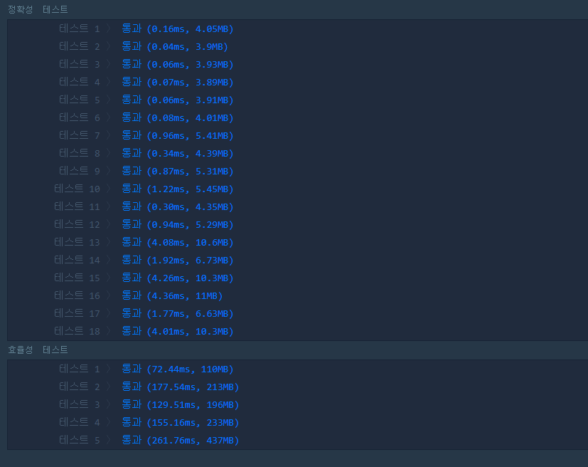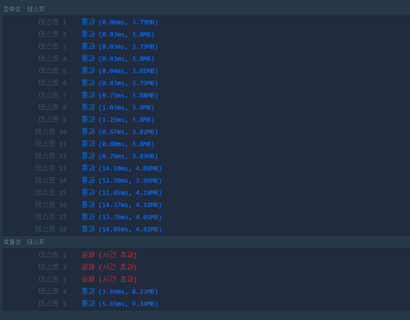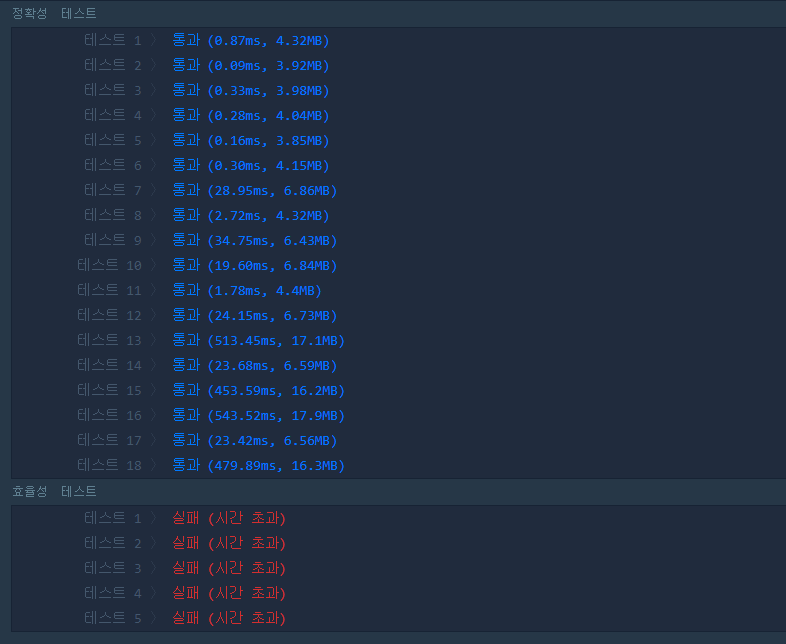 같이 스터디하는 인원 중 선형 탐색으로 풀이한 분이 있었는데, 효율성 테스트 1, 2, 3에서 걸려서 효율을 잡을 수 있는 부분에서 잡아서 작성해봤지만 효율성 테스트 1, 2, 3을 역시 통과하지 못 했다.