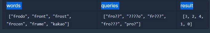 vector<string> quries = {"fro??", "????o", "fr???", "fro???", "pro?"};