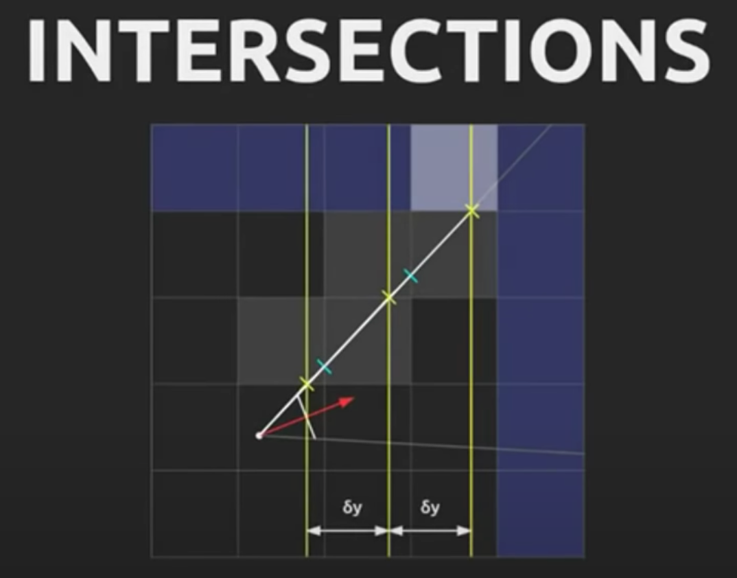 광선의 방향벡터를 구했다면, 비례식으로 가로축 교차점 부터 가로축 교차점 (dy), 세로축 교차점 부터 세로축 교차점(dx)까지 거리를 각각 구할 수 있다. dx, dy는 거리이므로 절대값을 이용하여 구해준다.
