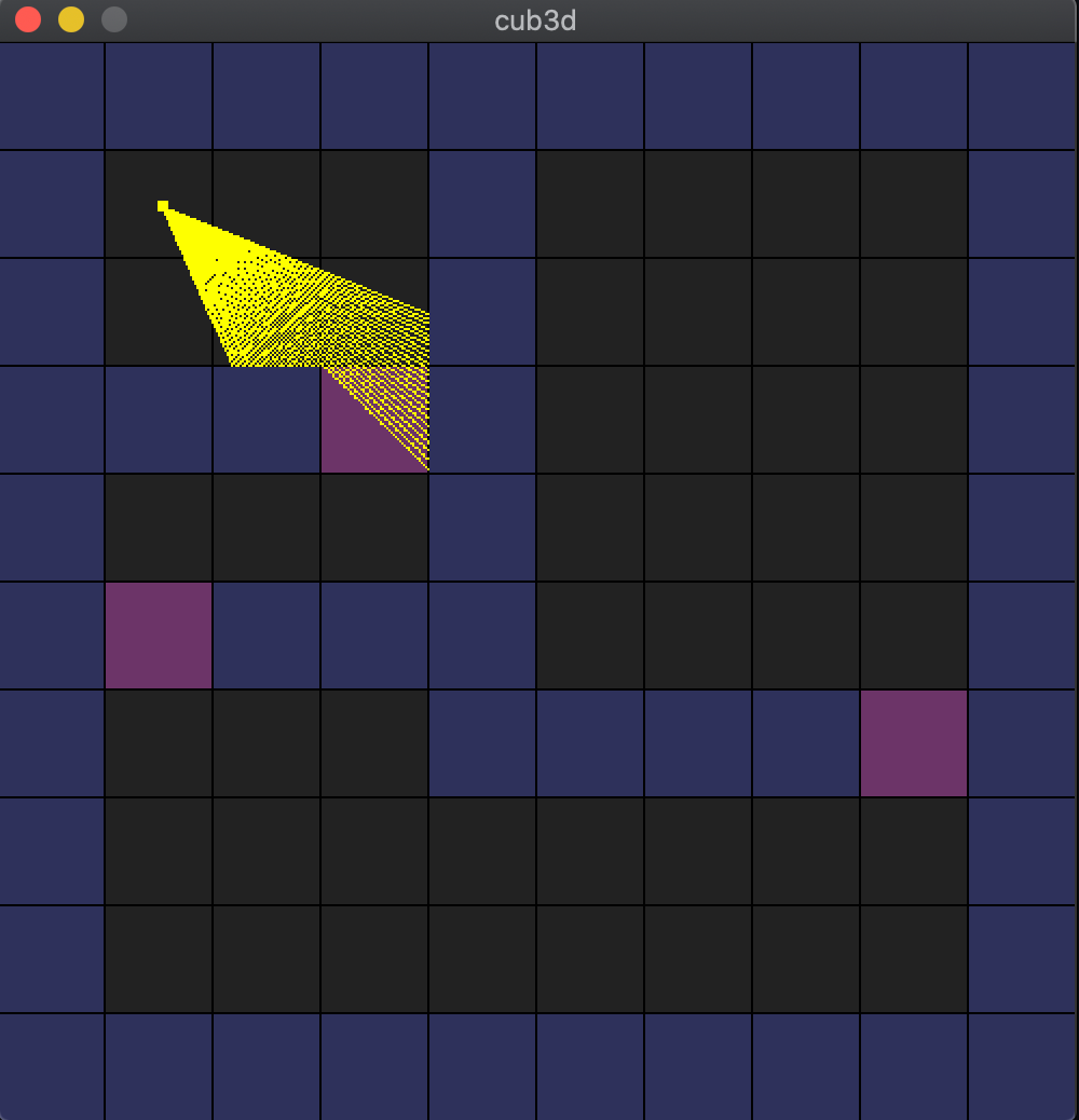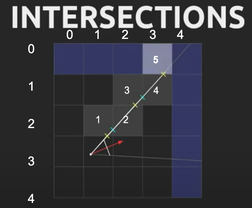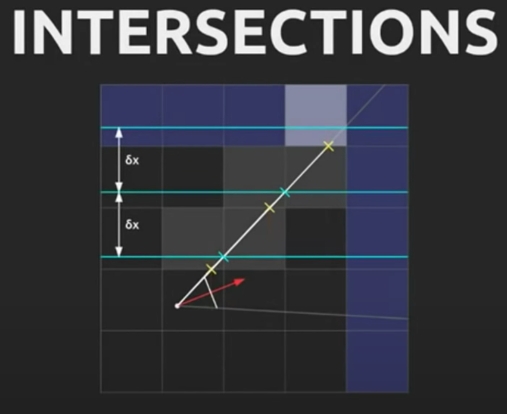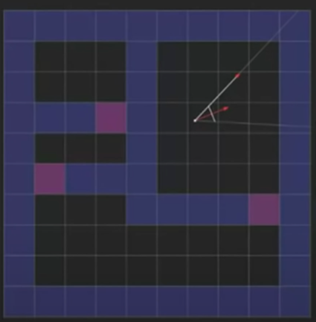 위 그림과 같이 맵을 격자로 구분한 뒤 맵 한 칸을 선그리기에서 하나의 픽셀이라고 생각한 후 DDA알고리즘을 진행하는 방식이다.