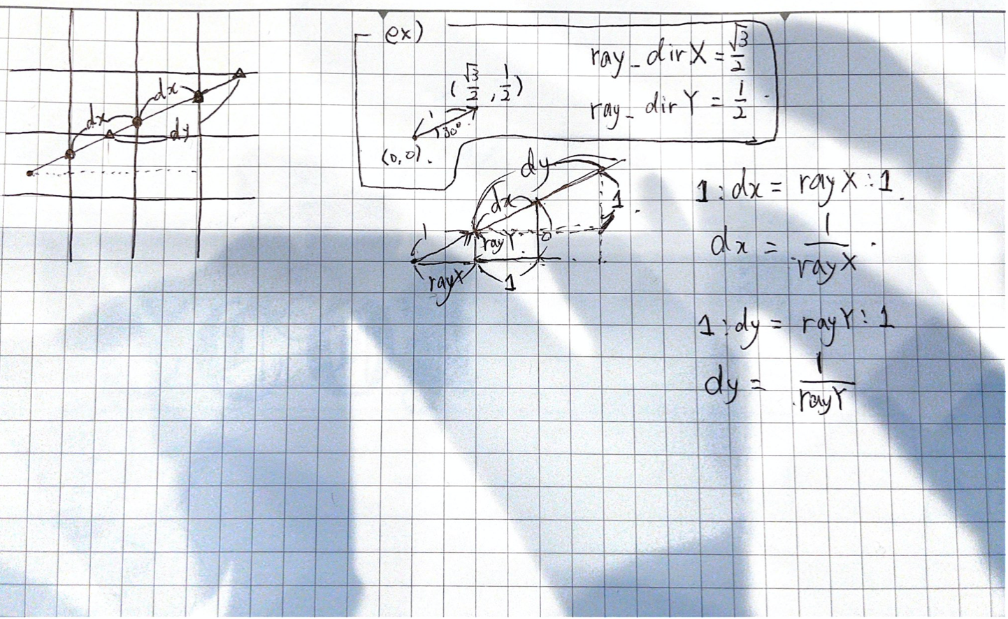 이제 앞서 설명한 DDA과정을 이용하여 벽을 찾아내고 벽까지의 (카메라 평면과)수직거리를 구하면 된다.