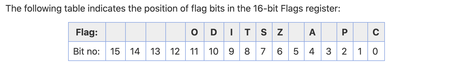 - Auxiliary Carry Flag (AF) − 산술 연산 후 비트 3에서 비트 4 로의 캐리를 포함합니다. 특수 산술에 사용됩니다. AF는 1 바이트 산술 연산으로 인해 비트 3에서 비트 4로 캐리가 발생할 때 설정한다.(It contains the carry from bit 3 to bit 4 following an arithmetic operation; used for specialized arithmetic. The AF is set when a 1-byte arithmetic operation causes a carry from bit 3 into bit 4.)