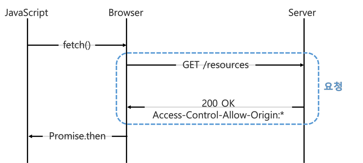 단순 요청 방법은 서버에게 바로 요청을 보내는 방법이다. 아래 그림은 자바스크립트에서 API를 요청할 때 브라우저와 서버의 동작을 나타내는 그림이다.