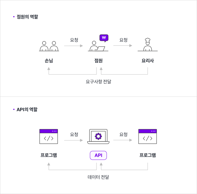 레스토랑에서 손님에게 주문 가능한 메뉴를 보여주고 손님이 고른 음식을 주방에 전달 후, 음식이 나오면 고객에게 전달하는 '점원'이 API이다.
