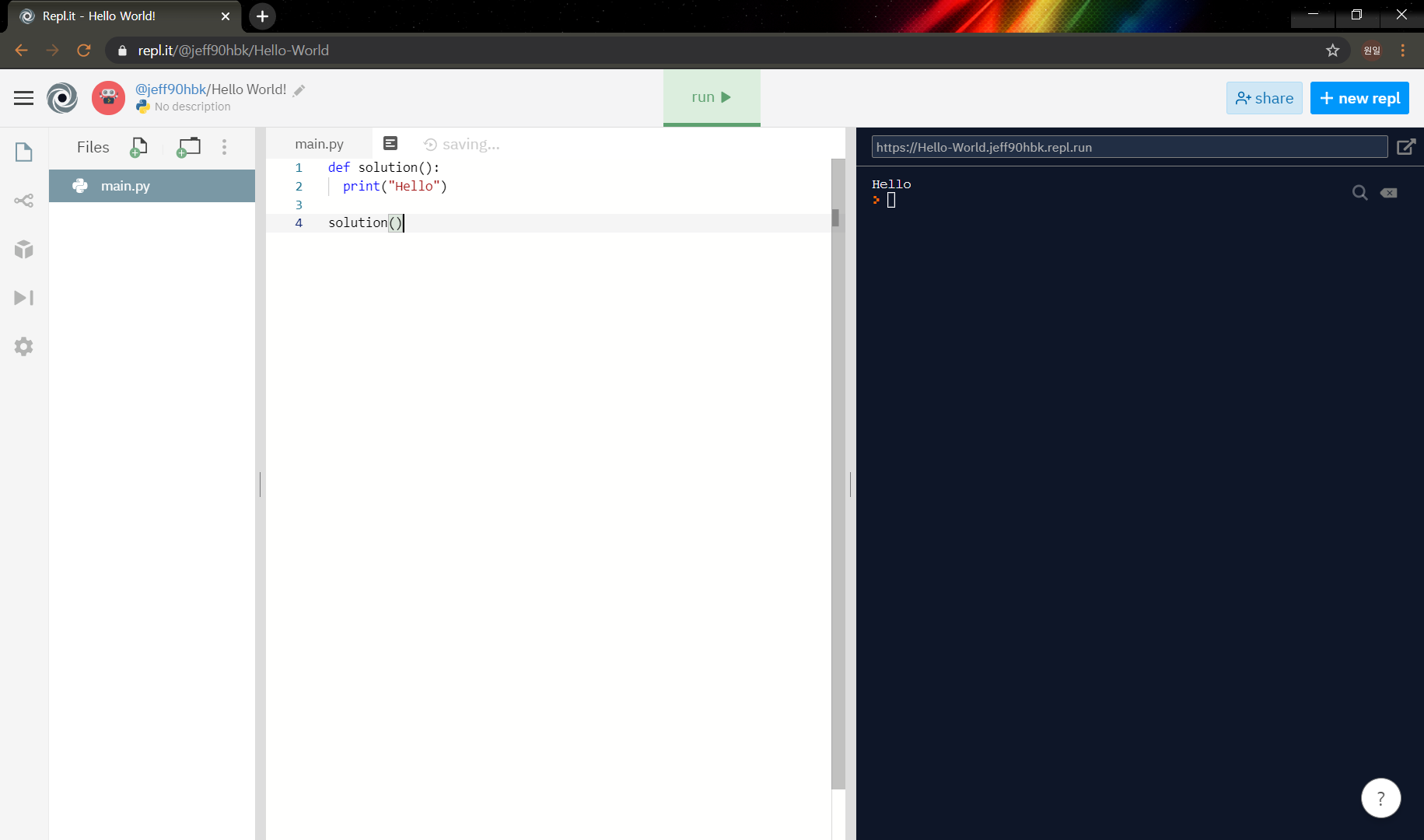 Repl it은 웹에서 코드를 실행시켜주는 사이트다. 구름 IDE와 비슷한 것 같은데 훨씬 간편한 것 같다.