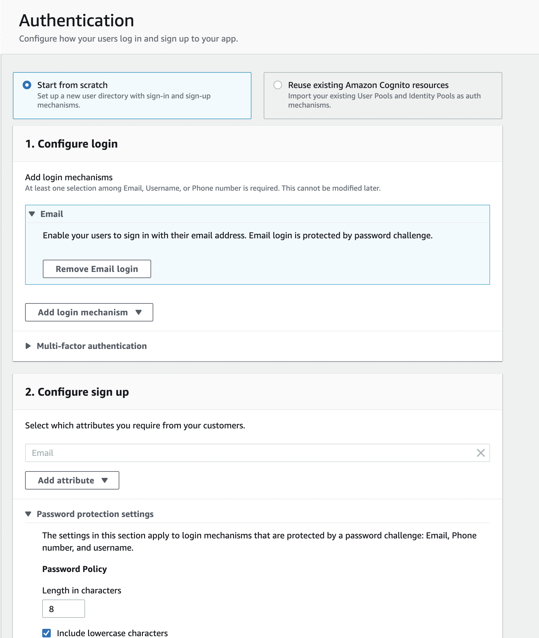 인증 방식에 대한 설정을 할 수 있다. email을 id로 할 것인지, username을 id로 할 것인지 비밀번호 구성은 어떻게 할 것인지 등