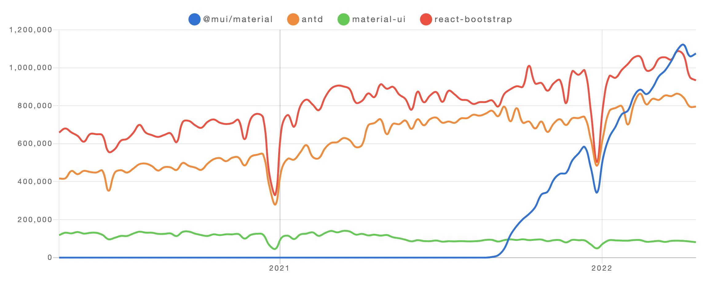 antd와 react-bootstrap은 꾸준한 인기를 보여주고, material-ui는 저조한 성적을 보이다가 MUIv5가 릴리즈 되면서 엄청난 속도로 상승하고 있다.