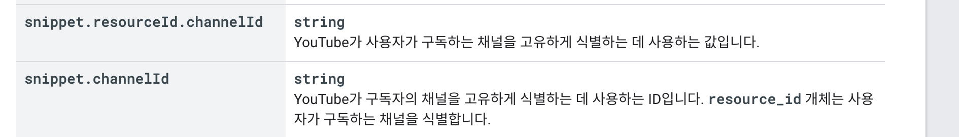 대략적으로 해석해보면 resourceId.channelId는 사용자가 식별하기 위함이고 channelId는 유튜브가 식별하기 위함인 것 같다.