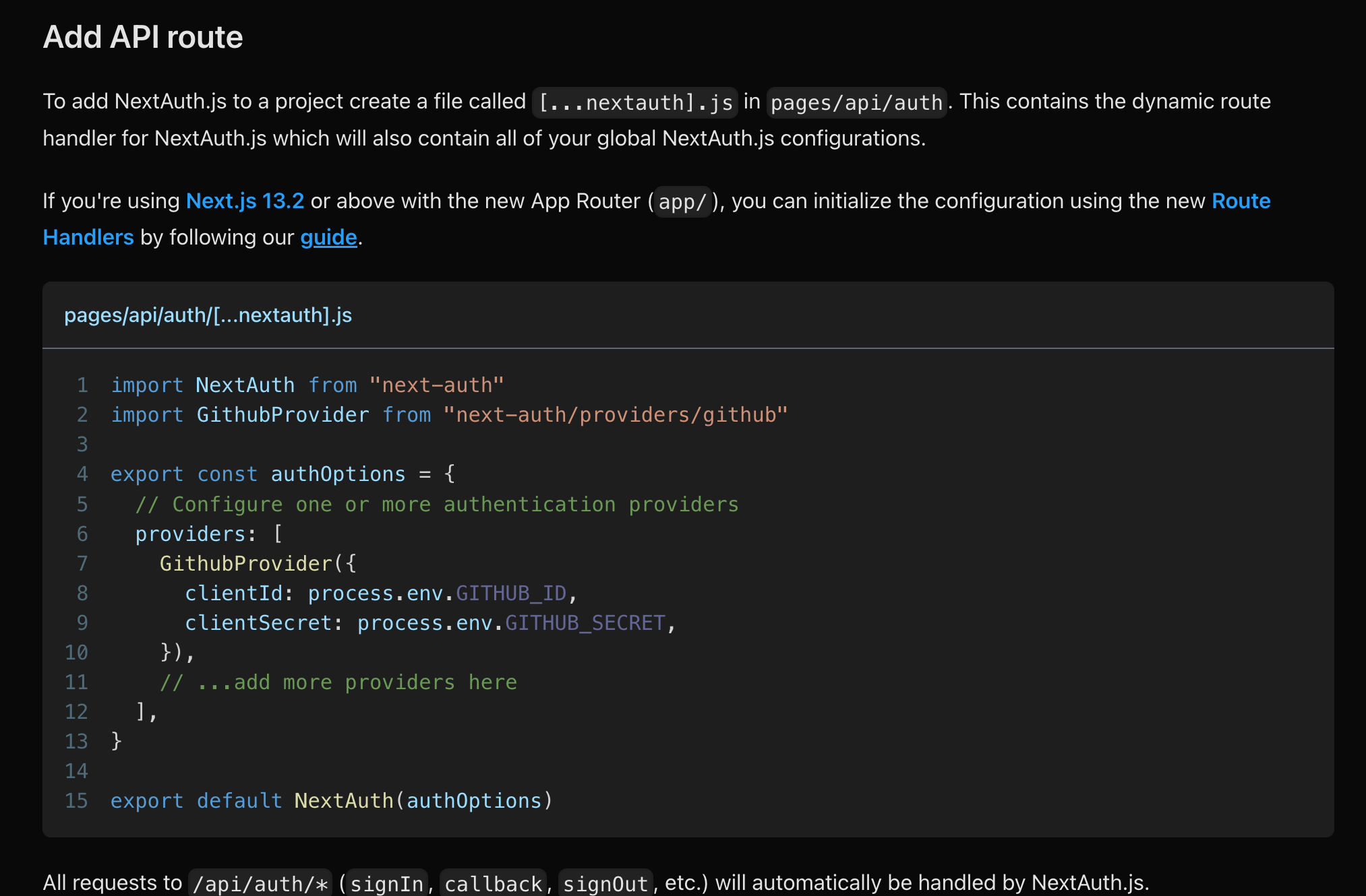 공식문서를 확인해보면 API route를 만들어주기 위해 pages/api/auth/[...nextauth].js 에 위와 같이 설정할 수 있다고 나와있다.