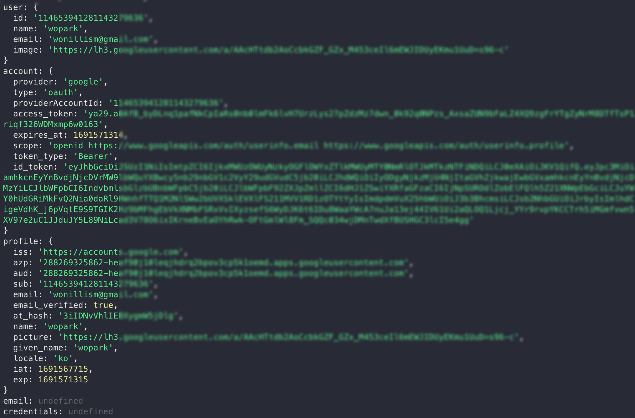 signIn callback의 인자는 위와 같이 user, account, profile, email, credentials를 제공하는데 어떤 값들이 들어오는지 콘솔을 찍어봤다.