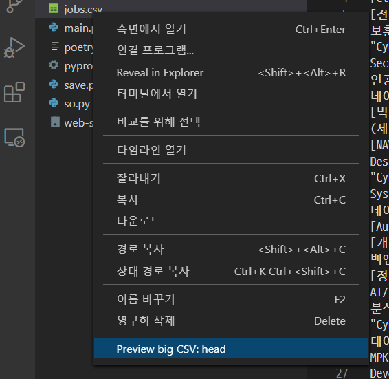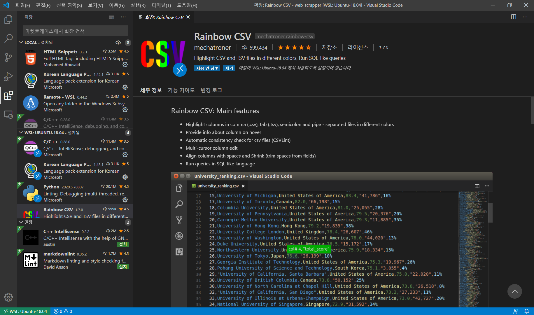 csv 파일을 좀 더 편하게 보고, 미리보기를 위해서 extension인 rainbow csv를 설치하자.