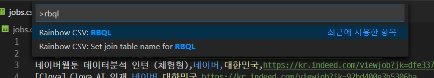 ctrl + shift + p를 눌러서 명령 팔레트를 키고 rbql을 입력해서 실행시키자.