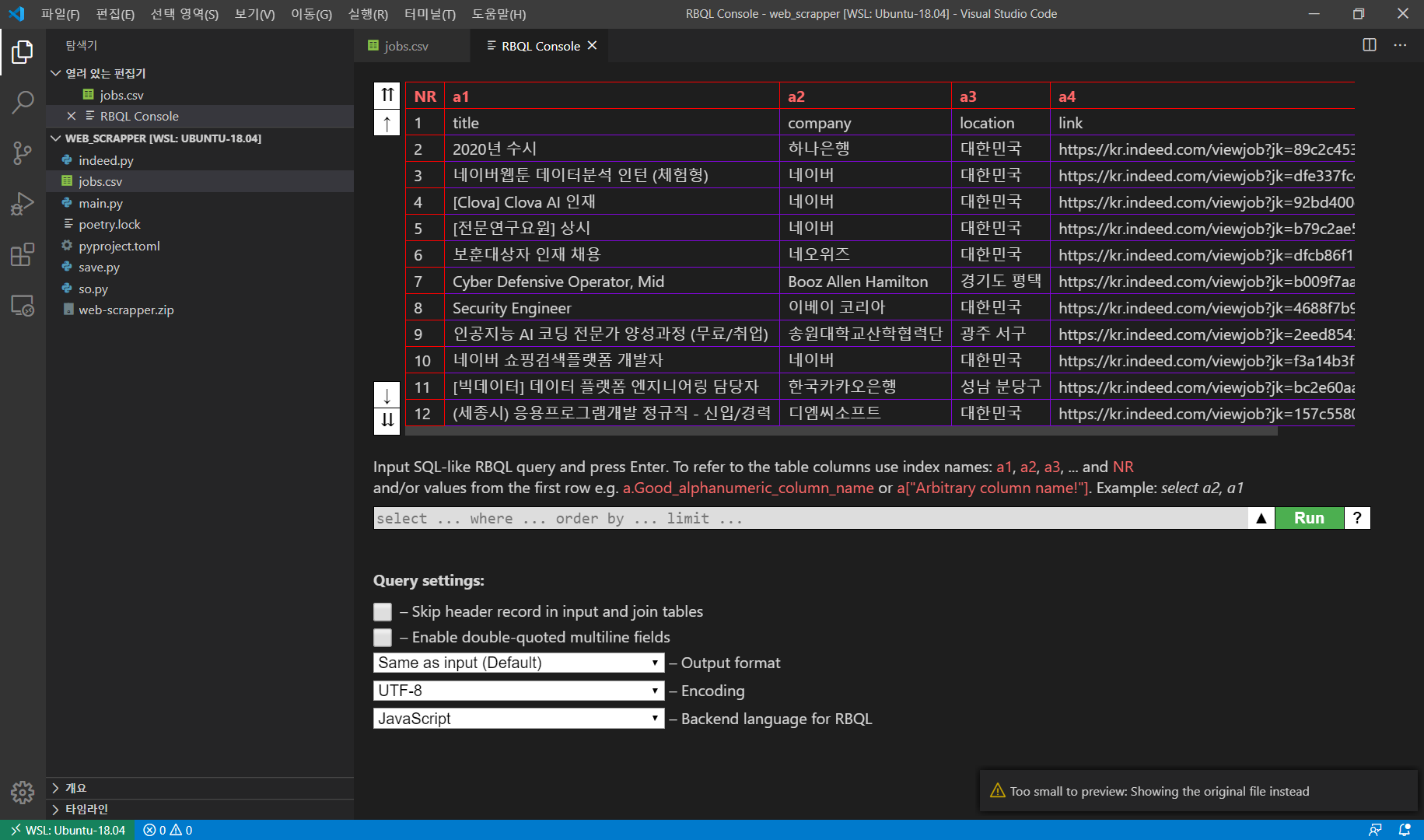 이렇게 알록달록한 csv를 볼수 있다. 미리보기기능도 제공한다.