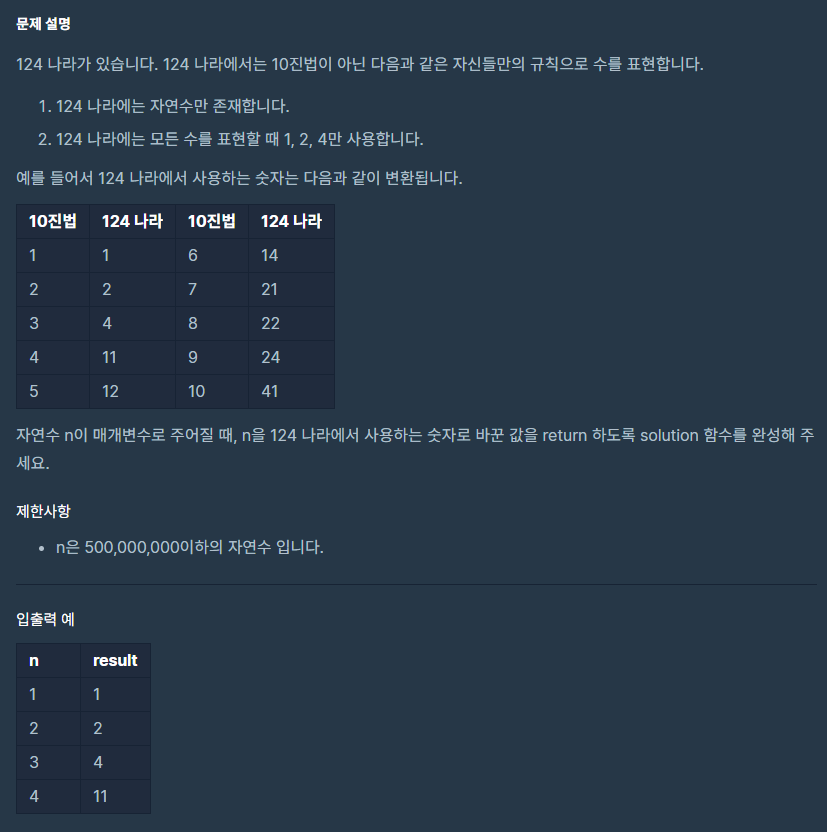 124 나라가 있습니다. 124 나라에서는 10진법이 아닌 다음과 같은 자신들만의 규칙으로 수를 표현합니다. 124 나라에는 자연수만 존재합니다. 124 나라에는 모든 수를 표현할 때 1, 2, 4만 사용합니다.
