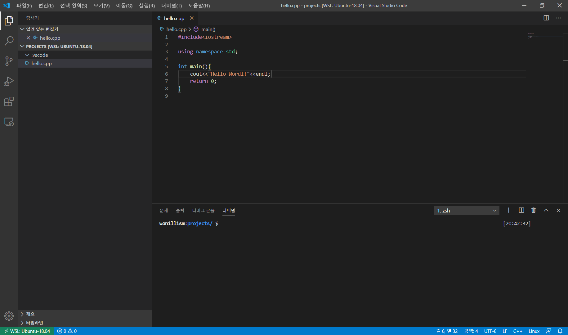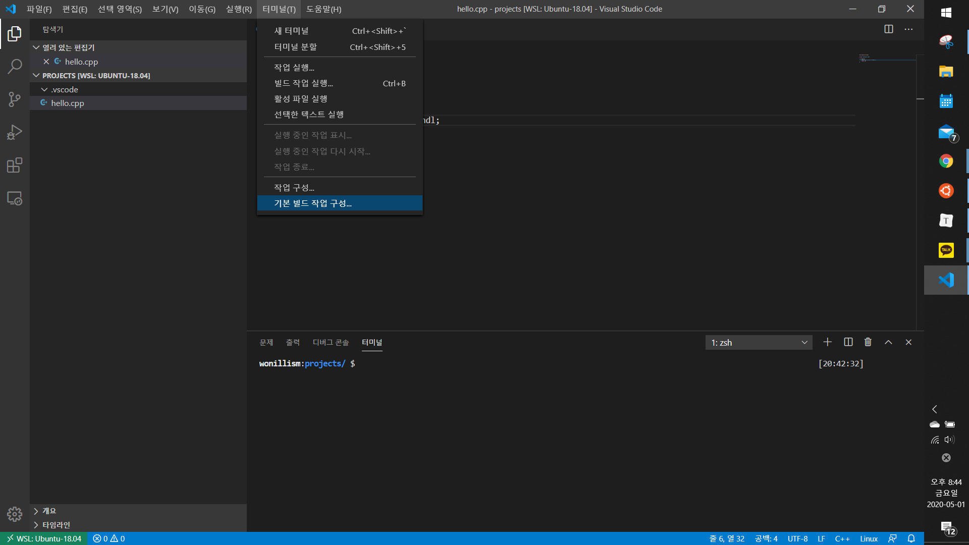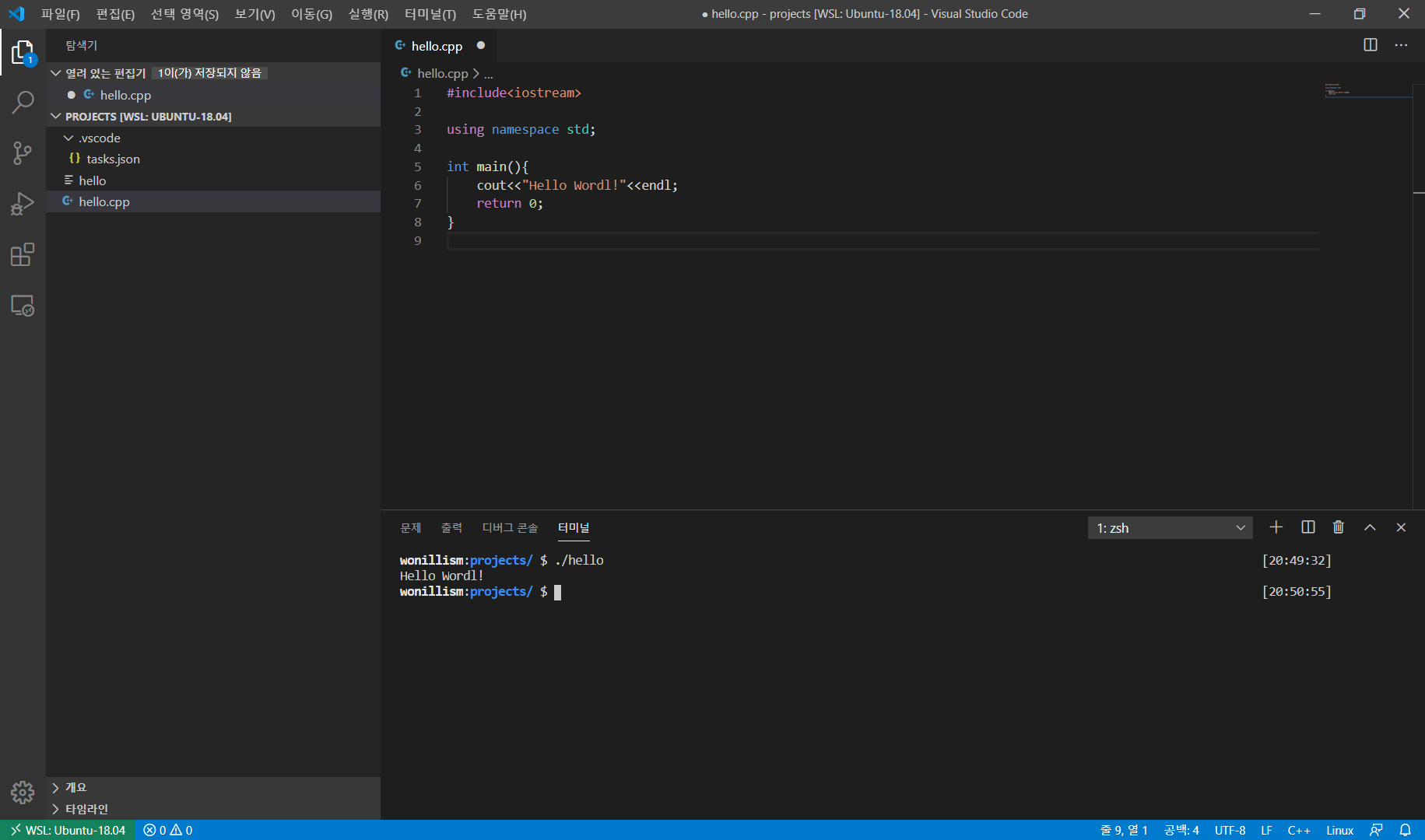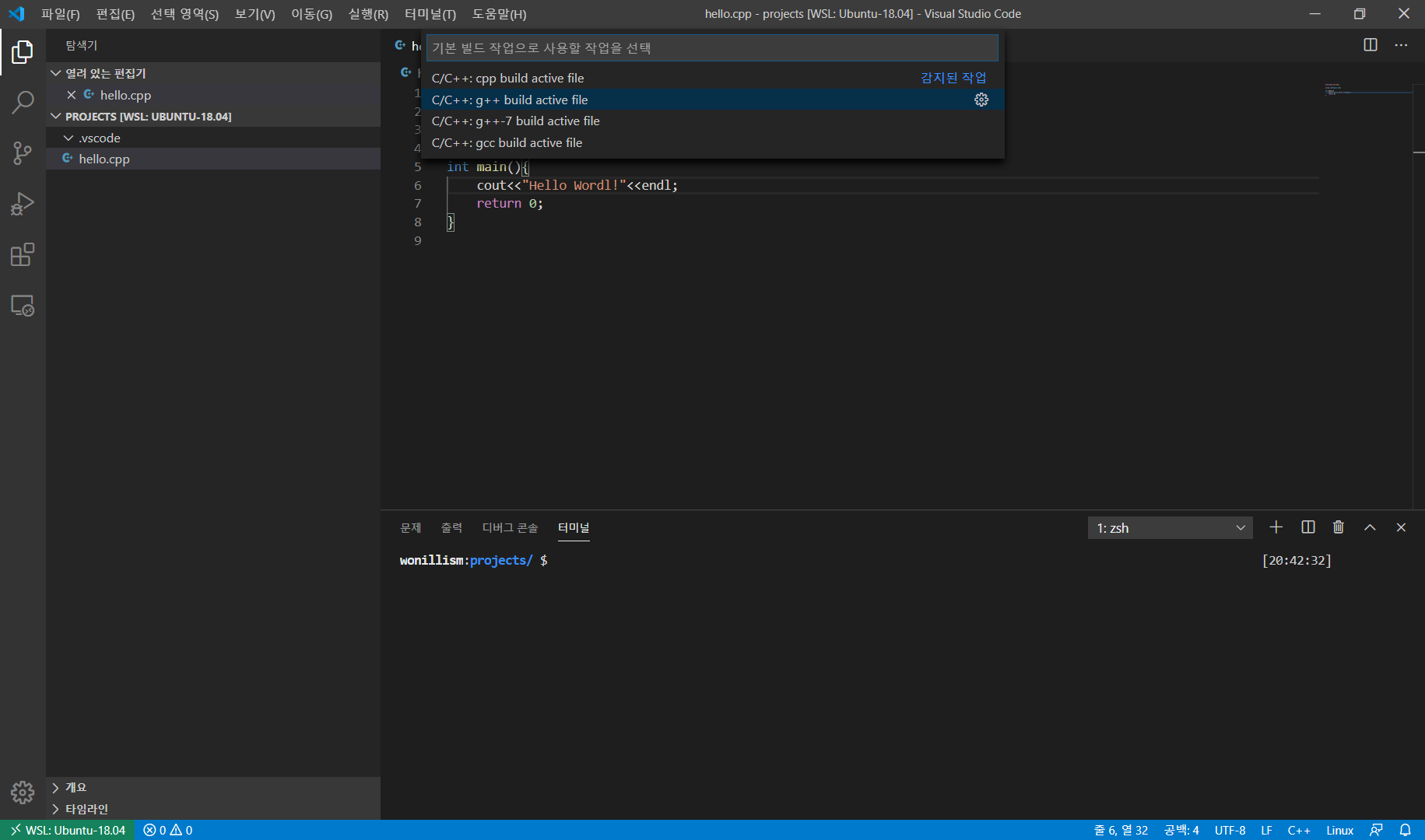 8. ctrl + shift + b를 눌러 빌드 > 터미널창(ctrl + ` or ctrl + j) > ./hello 입력