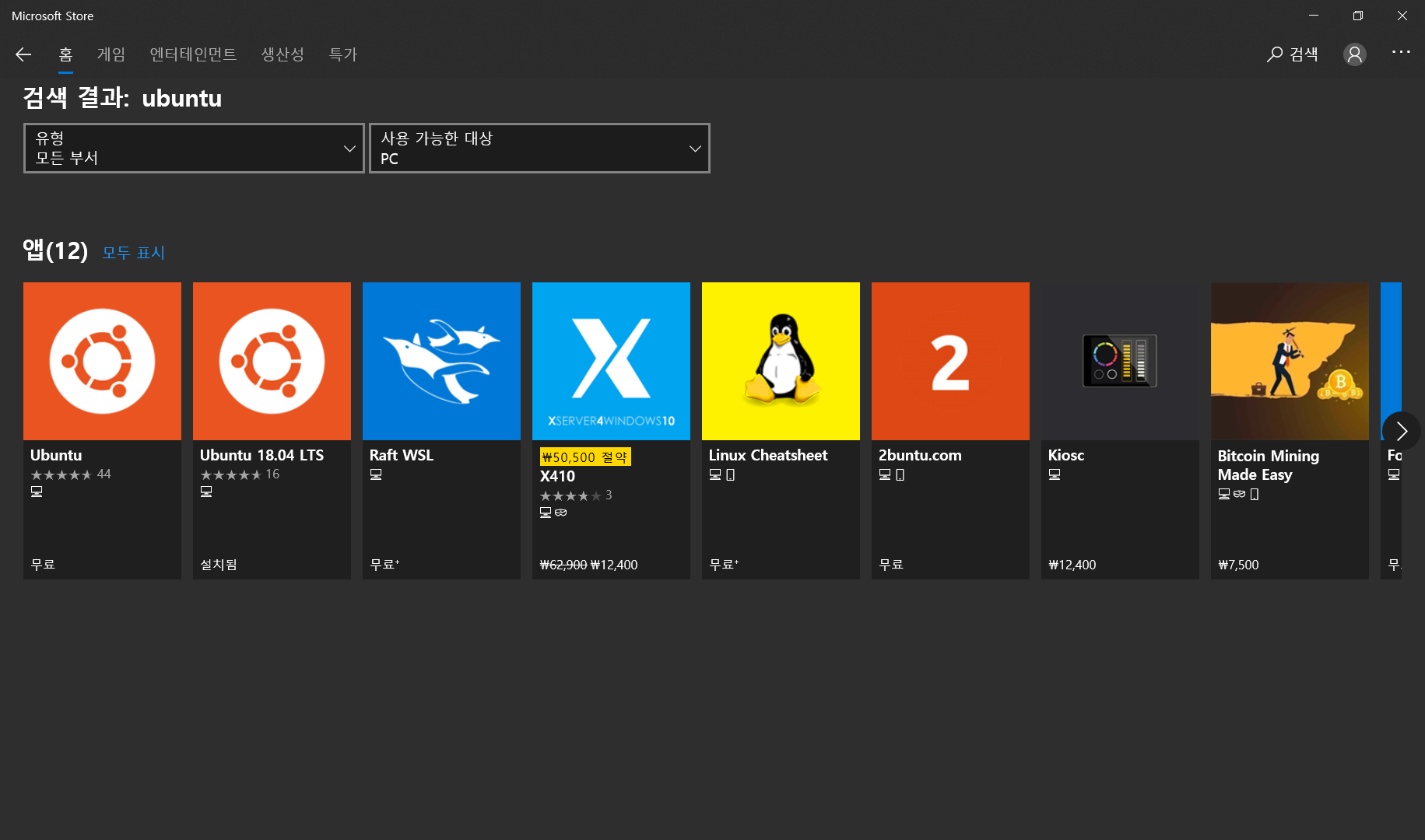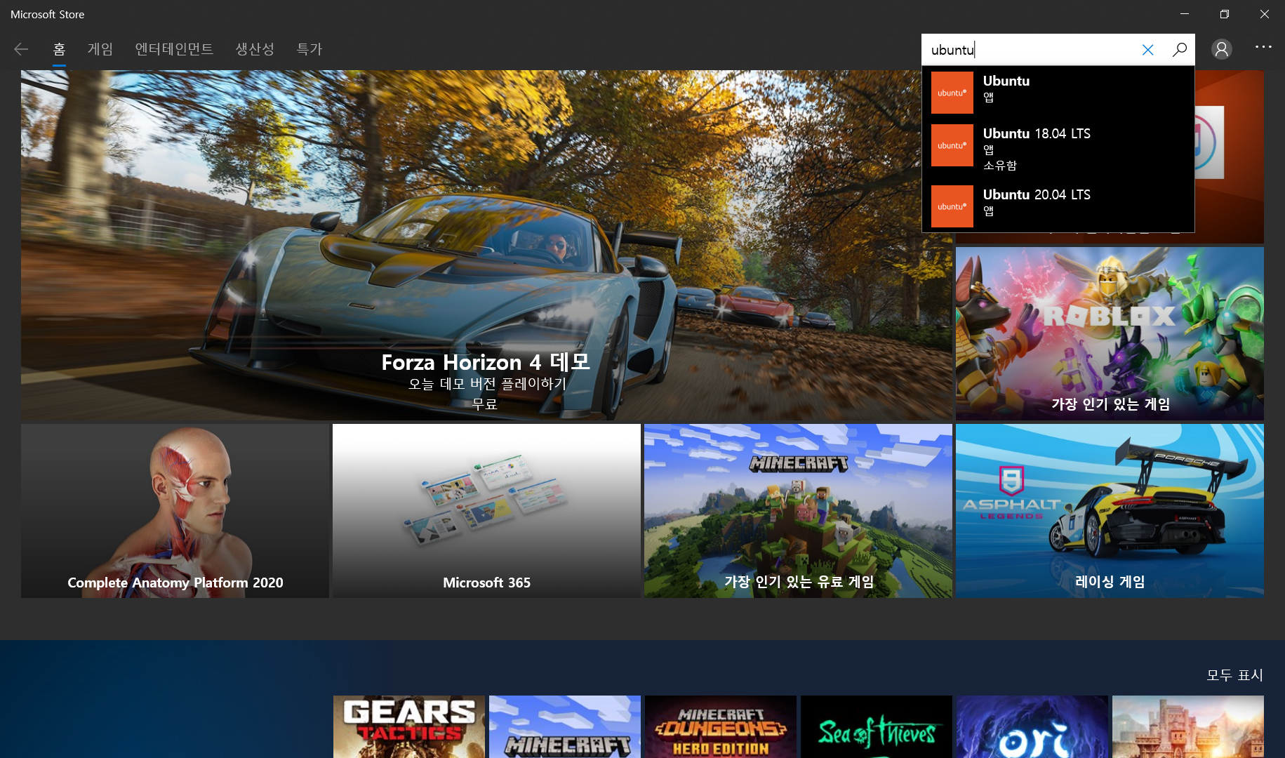 윈도우 키 > Microsoft Store 검색 > ubuntu 검색 > ubuntu 18.04 LTS 설치
