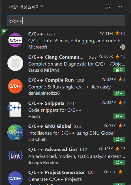 vscode 창이 켜지면 Extension > c/c++ 설치