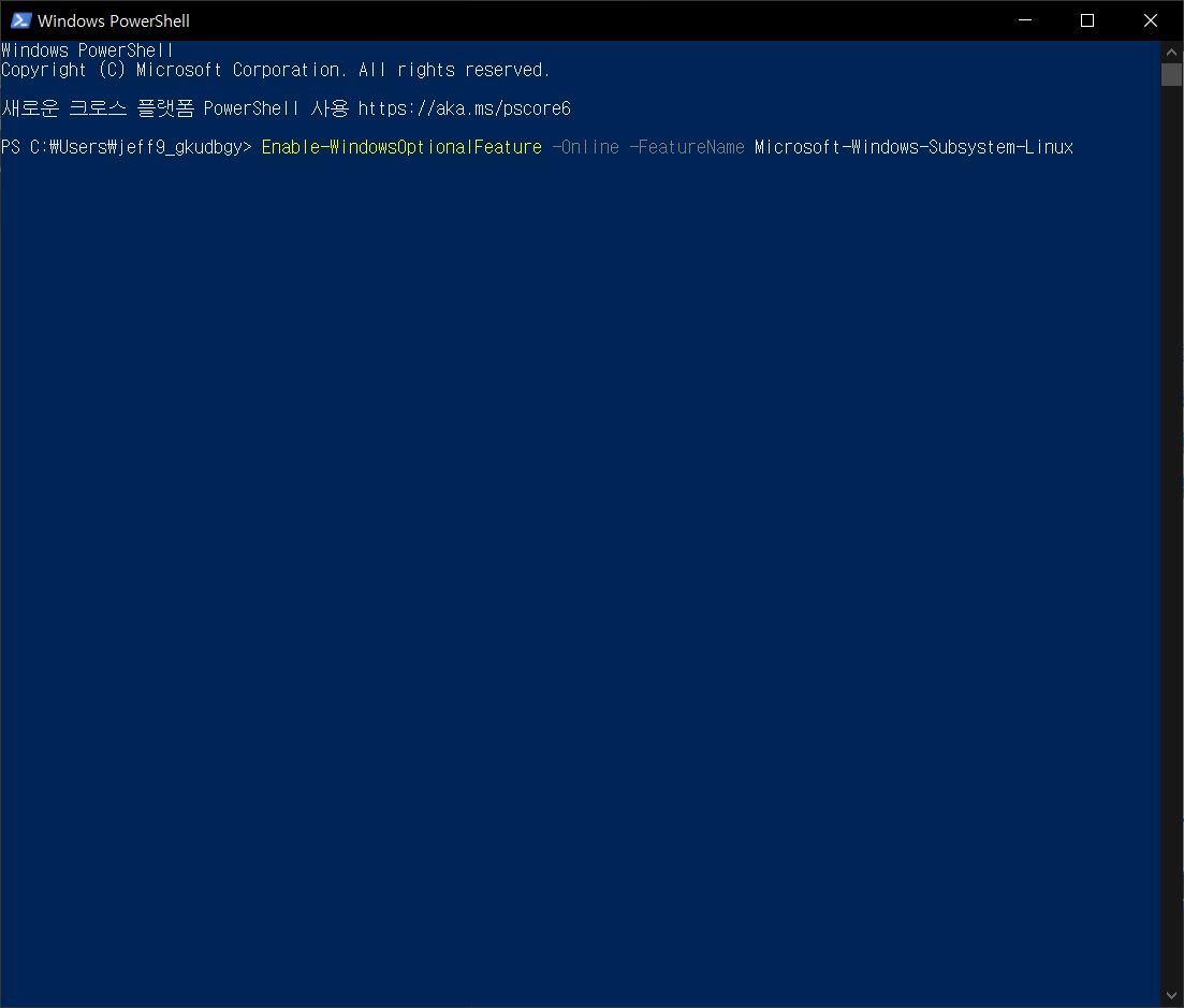Enable-WindowsOptionalFeature -Online -FeatureName Microsoft-Windows-Subsystem-Linux입력