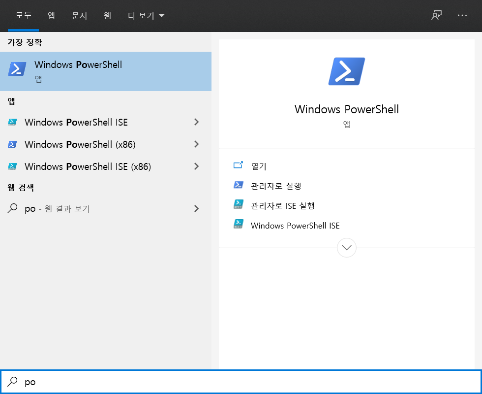시작 > Power Shell 검색 > 관리자로 실행